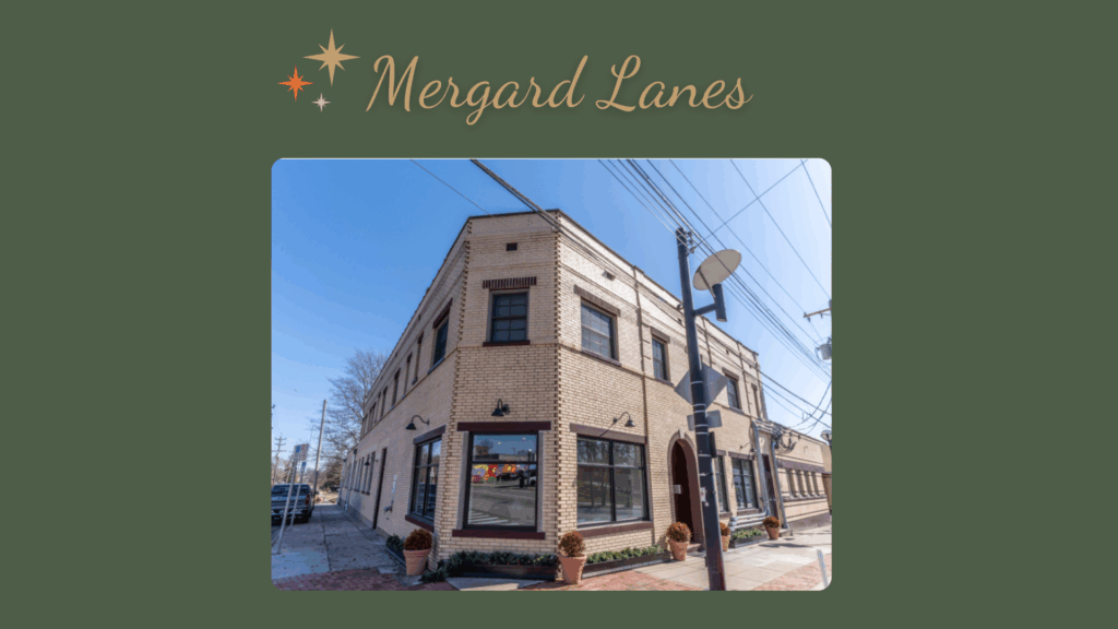 Mergard Lanes was built as a community bowling alley in 1930 in the Art Deco Style. Glass block and curved features contribute to its Art Deco