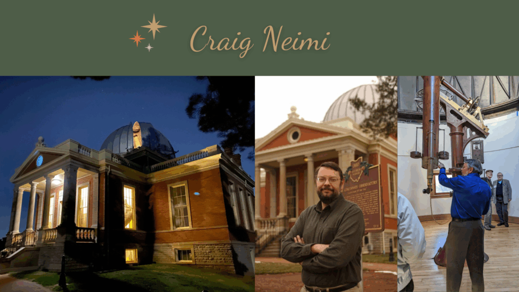 Craig is the former Observatory Executive Director and current Facilities and Collections Manager. He has been on staff for almost 20 years, while he and his wife Val have been involved with the Observatory even longer. In his time as Executive Director, Craig managed the Observatory’s two beautiful Hannaford buildings as well as the 10+ acres of grounds to ensure that the Observatory can host what began as a few thousand people a year but is now 40,000 visitors annually.