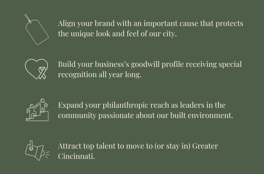 Cincinnati Preservation helps ensure our region maintains an authentic sense of place that businesses and their staff enjoy. When your company stands in support of historic preservation, you also: