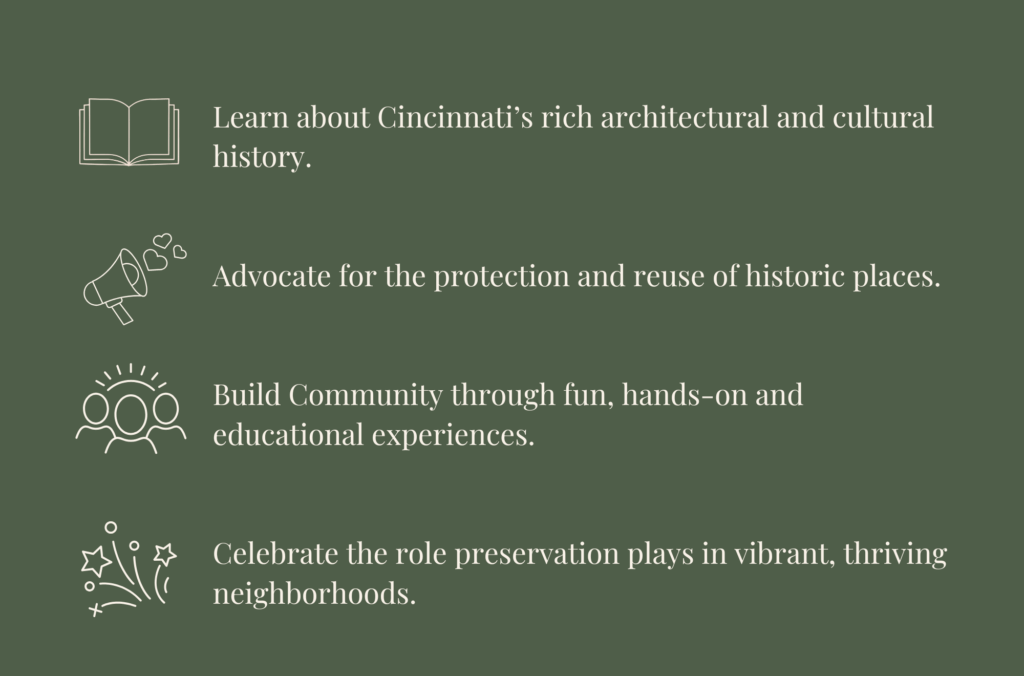 Have full membership access to Cincinnati Preservation programing and events at a reduced price of $25