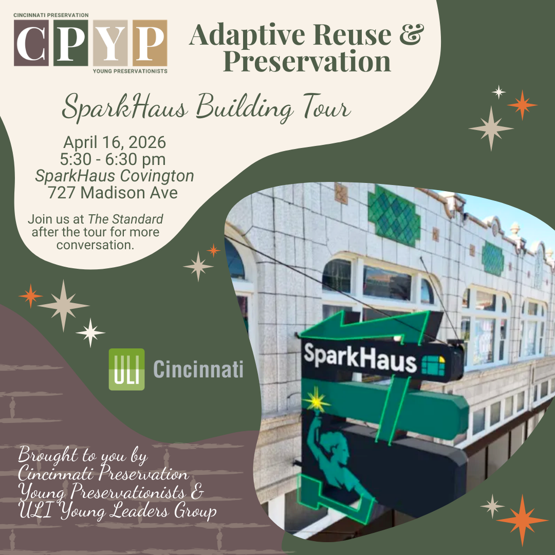 Not a member? Join or renew your membership today! If you’re unsure of your membership status, contact Susan Casey at susan@cincinnatipreservation.org—she’s happy to help.