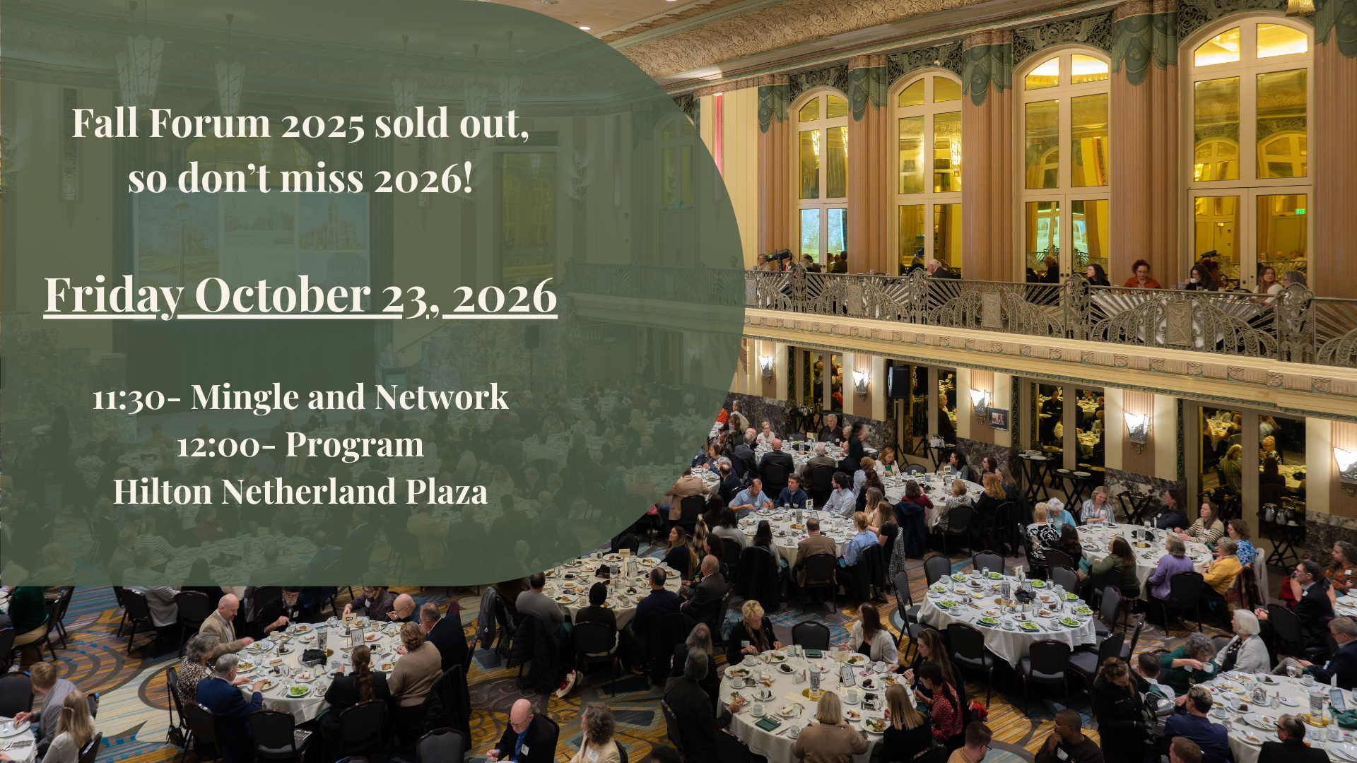 Every fall since 1995, Cincinnati Preservation has brought people together from across the Cincinnati region for Fall Forum, our signature celebration of ideas, inspiration, and the stories that shape our communities. Each year, we welcome a nationally renowned speaker who dives into a topic of local interest and sparks big conversations about the past, present, and future of the region’s historic places. And we gather in style at noon in the iconic Hall of Mirrors at the Hilton Netherland Plaza, one of the grandest ballrooms in the Midwest. It all comes together for an unforgettable afternoon of learning, connection, and a little Cincinnati magic. Whether you are a preservation pro, a curious neighbor, or someone who simply loves this region, Fall Forum is the place to be every autumn.