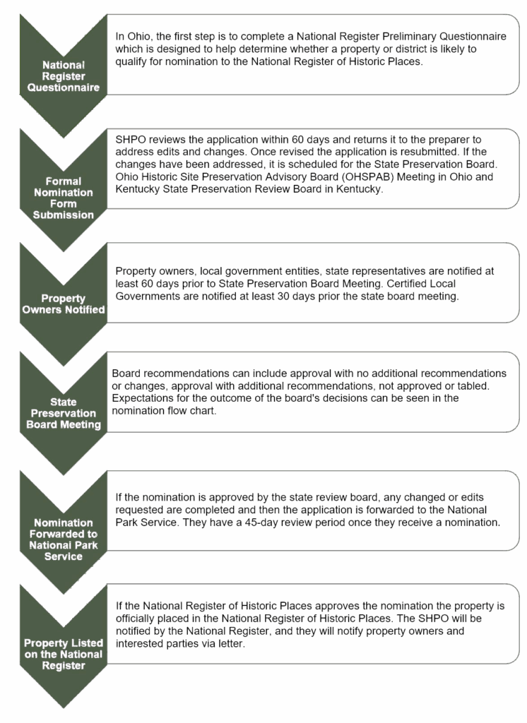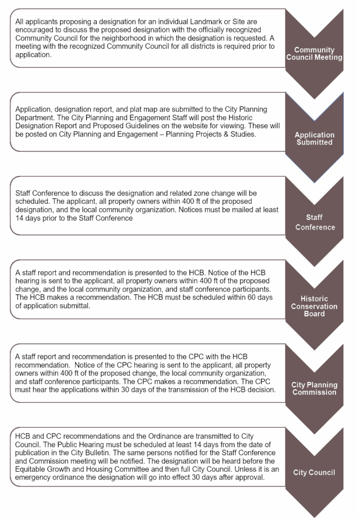 Historic Designation Process is the local approval process for establishing a local historic district and/or landmark within municipalities that have a preservation ordinance that allows for historic designation. While each municipality will have slightly different requirements for an application and processes, a typical process will include an application submitted to the City Planning or Preservation Office, Public Notice, Hearing at the Design Review Board, Hearing at the Planning Commission, Hearing and Decision at City Council/Commission, especially if the historic designation is attached to zoning. The process outlined in the chart is the process for the City of Cincinnati.